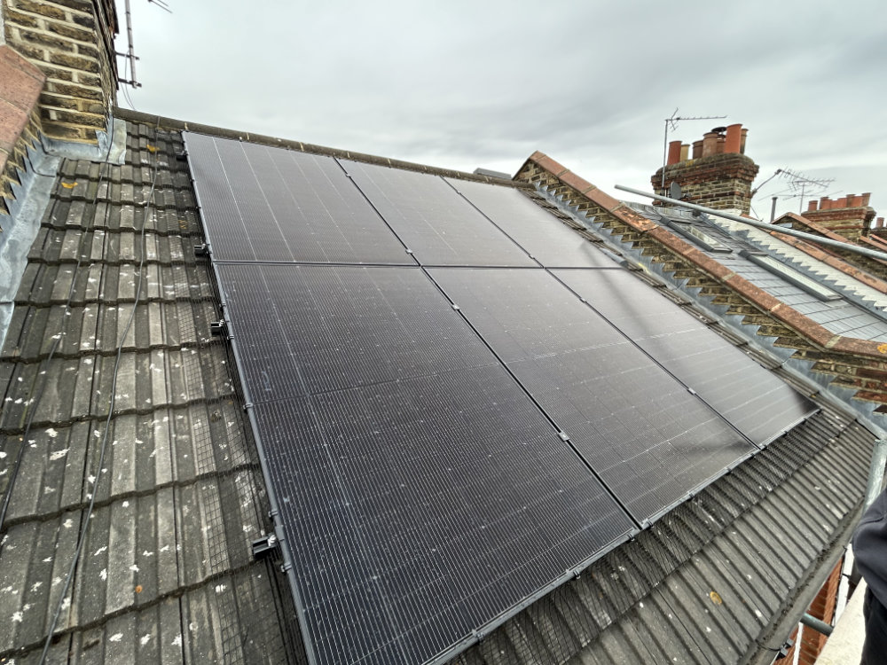 6x All black 455 watt solar panels on the front roof, a 5kw storage battery and a very tricky cable run!